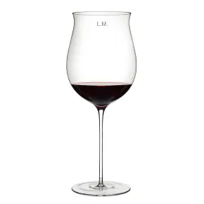 A personalized handblown Burgundy wine glass made from lead-free crystal, designed to enhance red wine aroma, flavor, and elegance.
